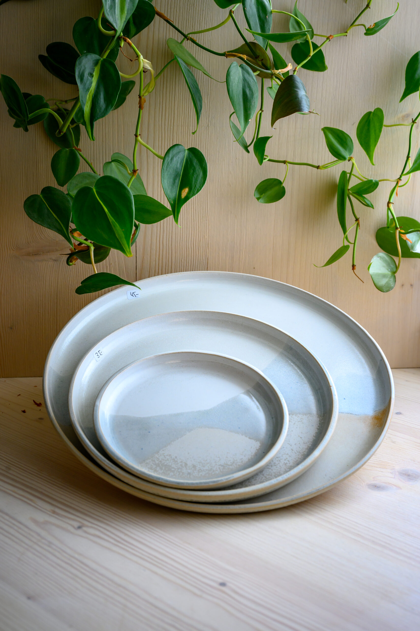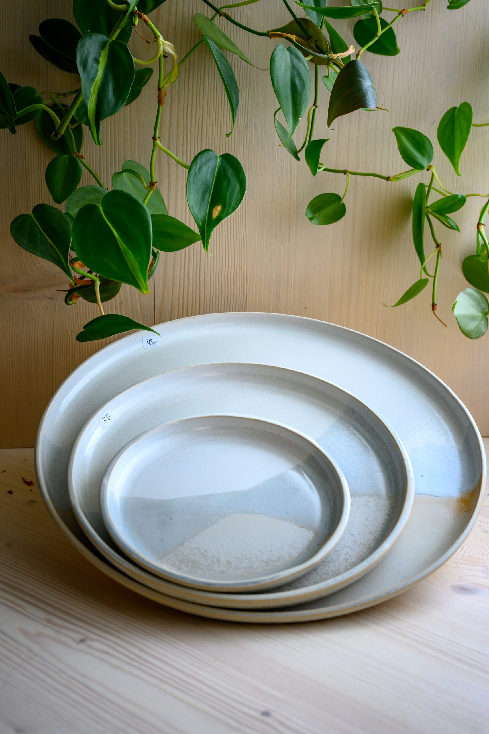 Cette assiette blanche se teinte de délicates nuances de bleu clair, comme un ciel traversé de nuages.