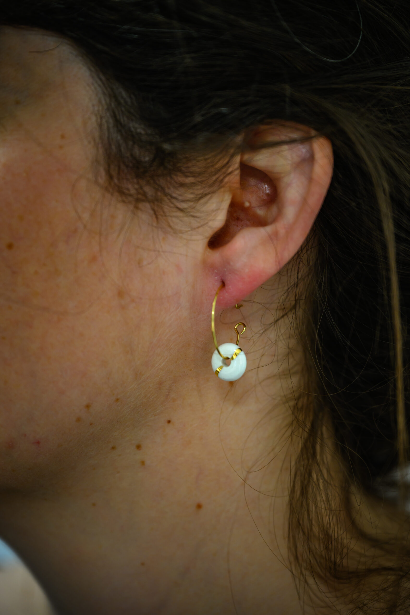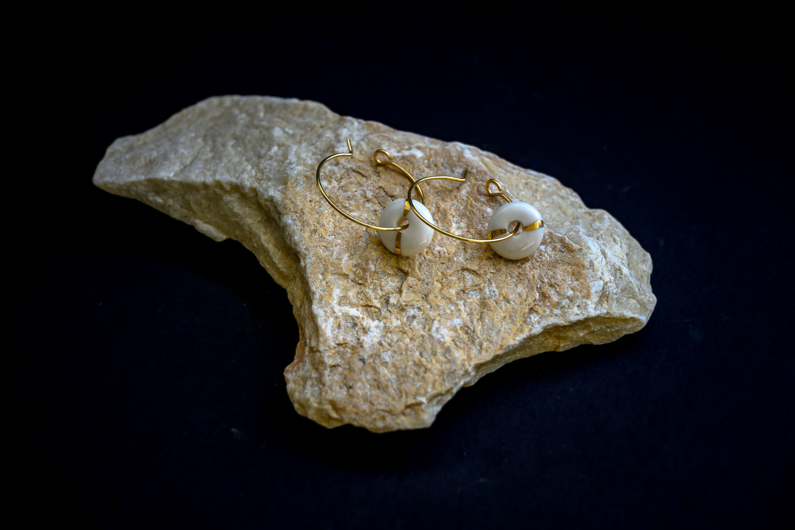 Chaque pièce est unique, ces boucles d’oreilles sont en porcelaine, elles sont accompagnées d’une fine ligne d’or. Ce qui permet de souligner la forme et d’avoir un résultat unique.