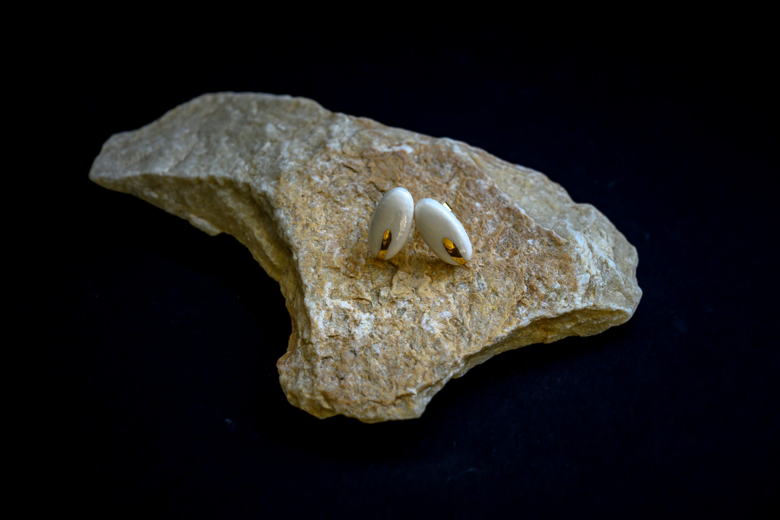 Chaque pièce est unique, ces boucles d’oreilles sont en porcelaine blanche, elles sont accompagnées d’une fine ligne d’or. Ce qui permet de souligner la forme et d’avoir un résultat unique.