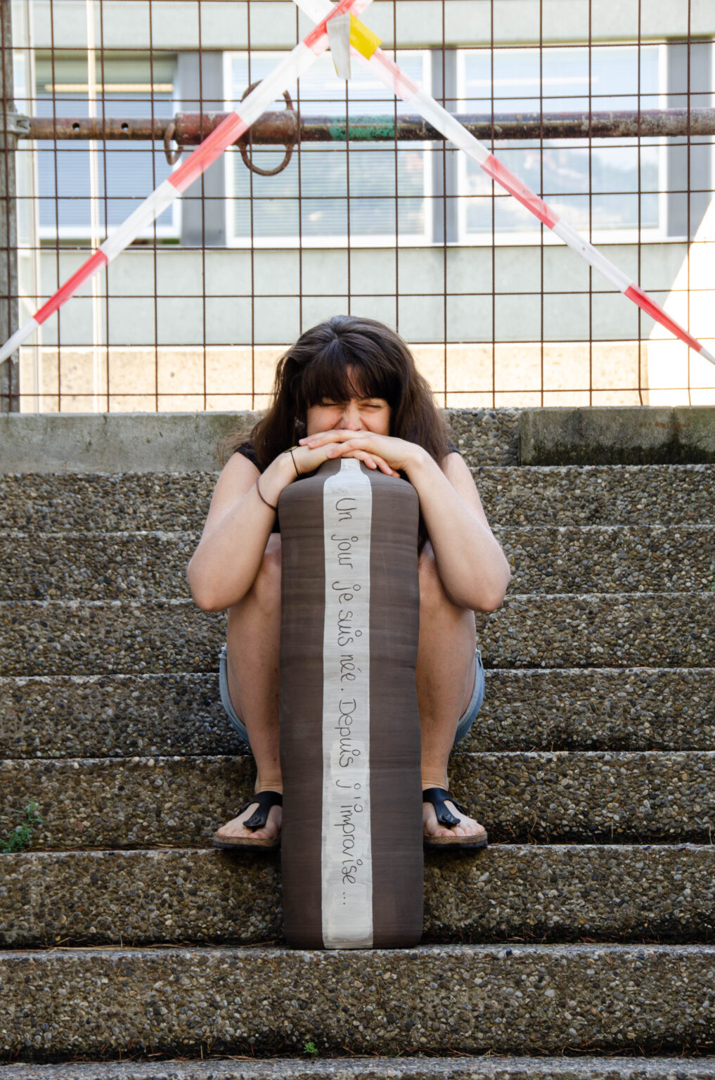 Pour le cours de photographie, j’ai choisi une interaction avec l’objet. Je suis assise derrière, simplement présente, tandis que la pièce apparaît en premier plan, laissant l’objet parler avant moi.