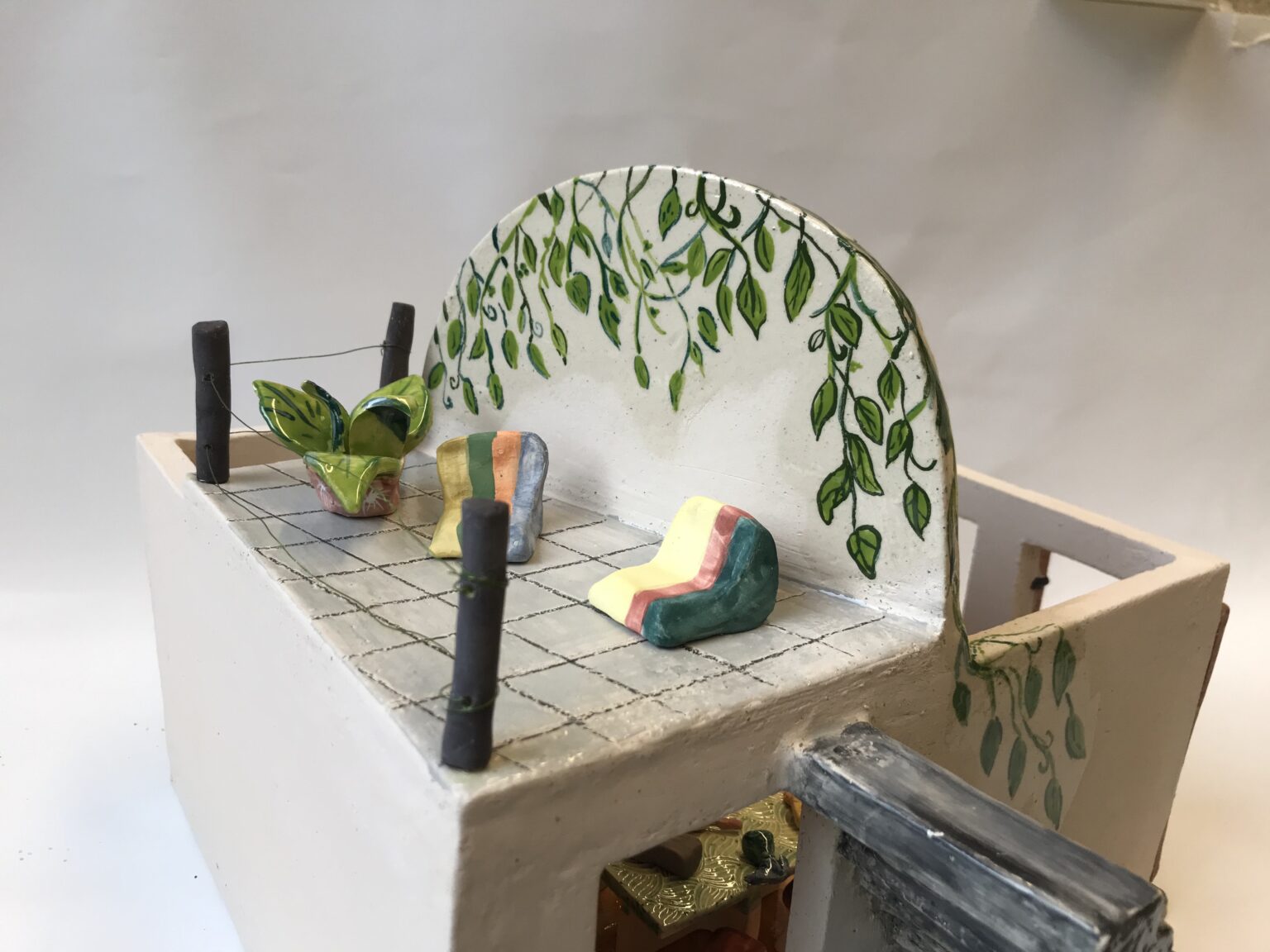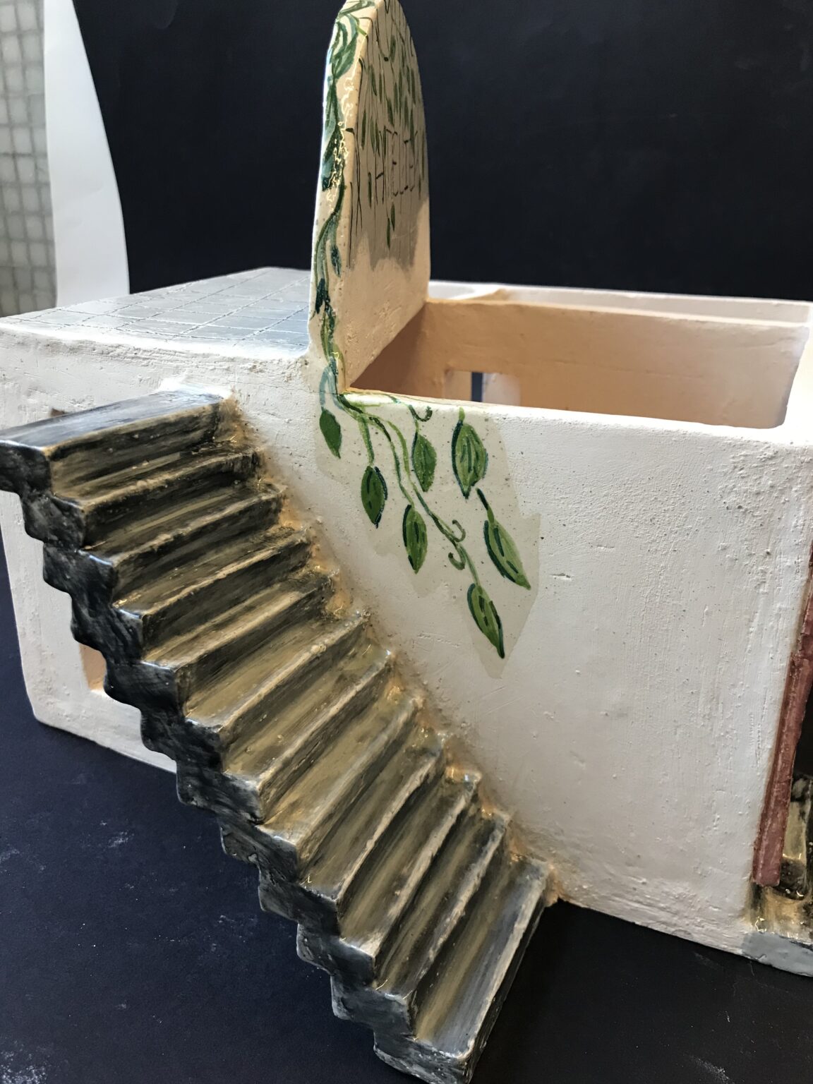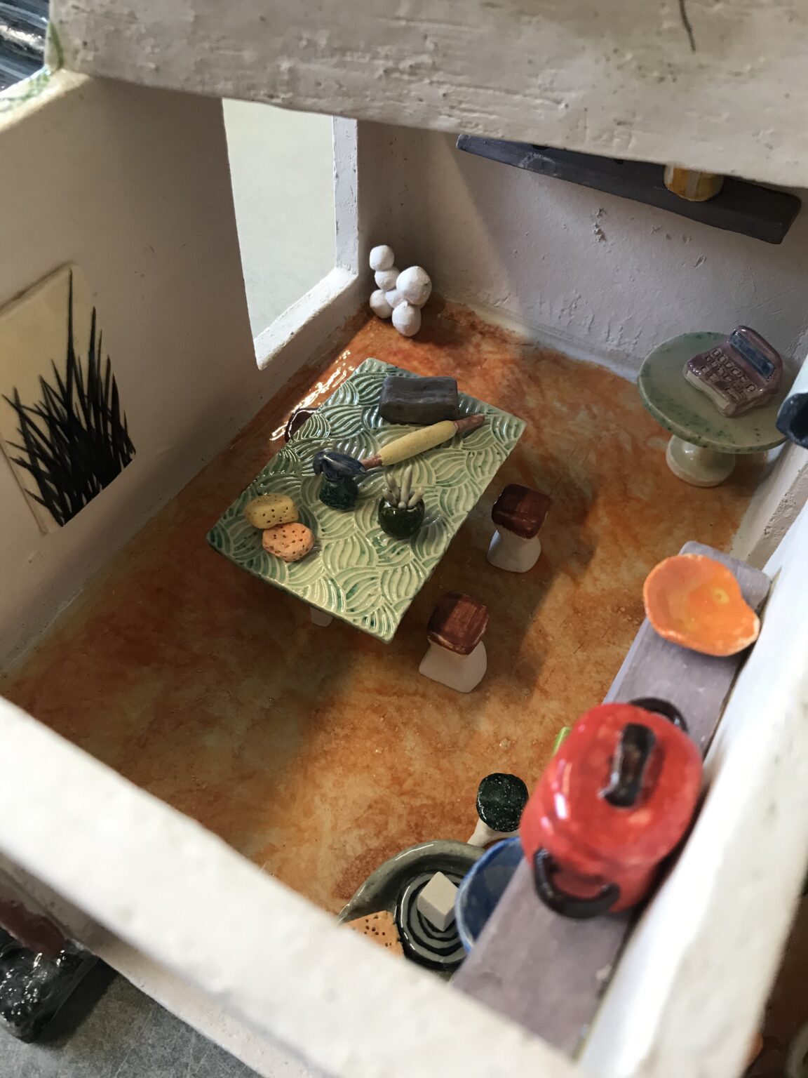 Lors de ma formation, j’ai également dû réaliser un mini atelier de céramique. Même si le travail de la miniature ne correspond pas particulièrement à ma pratique, l’exercice a été une expérience plutôt rigolote. Cela m’a surtout permis de me rendre compte que je ne serai jamais architecte : pour accéder à une terrasse, il est essentiel de ne pas laisser d’espace vide pour monter sur un toit… 🙂