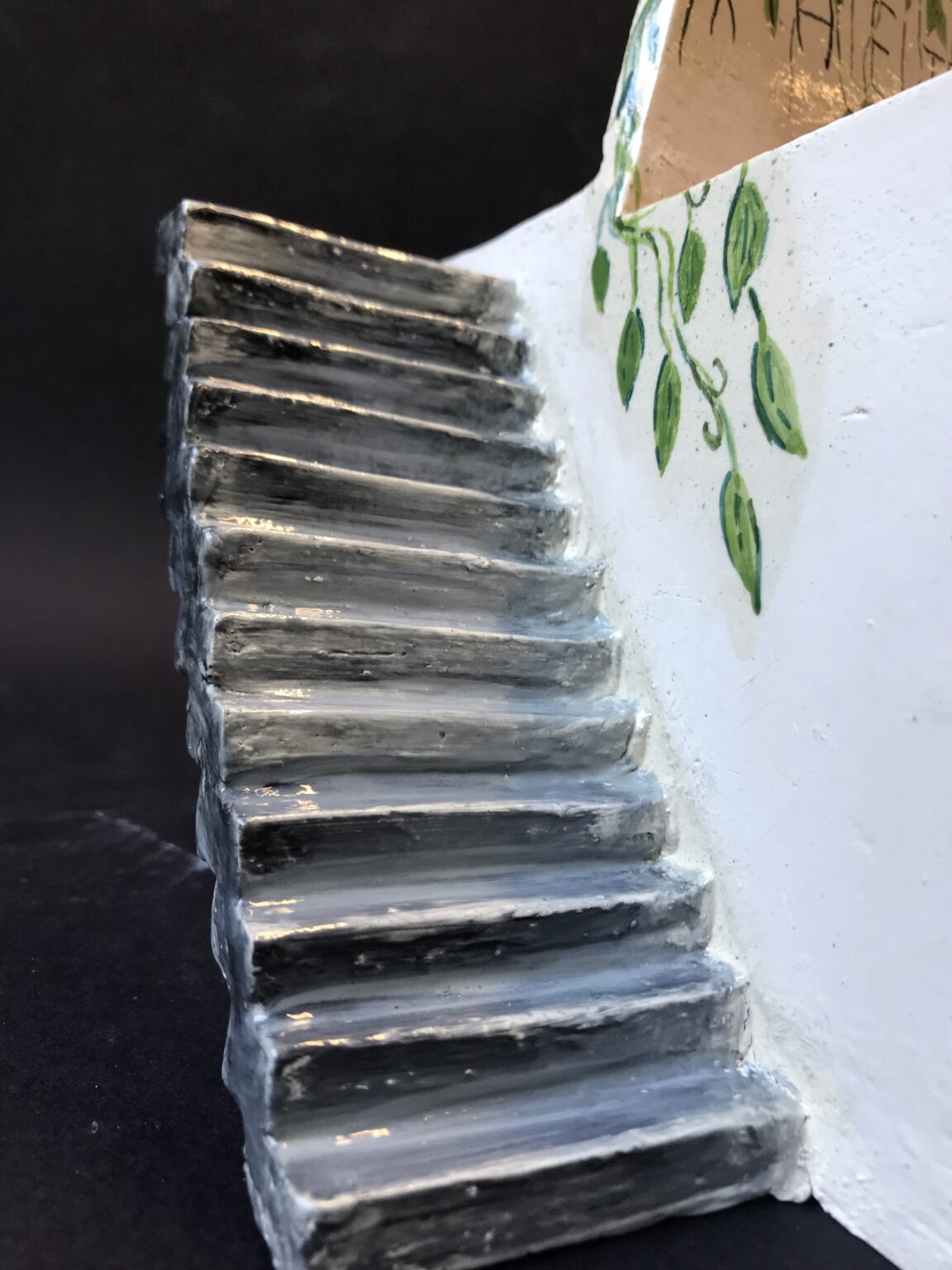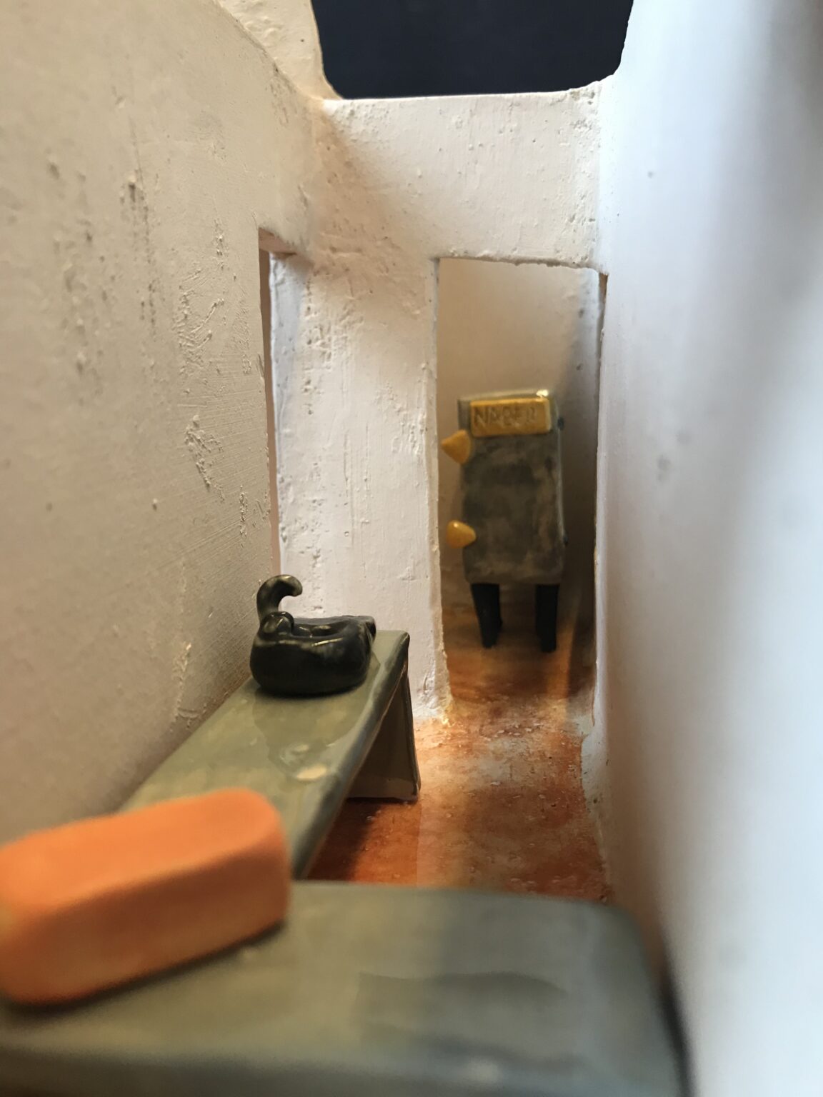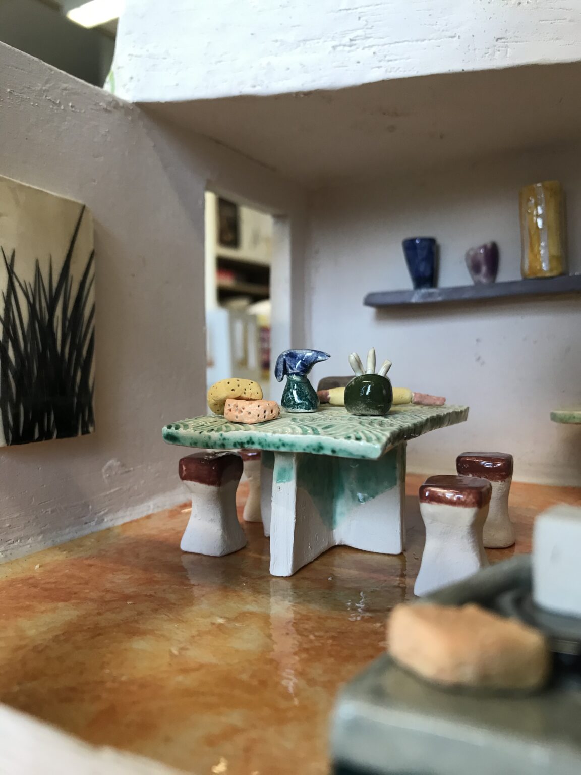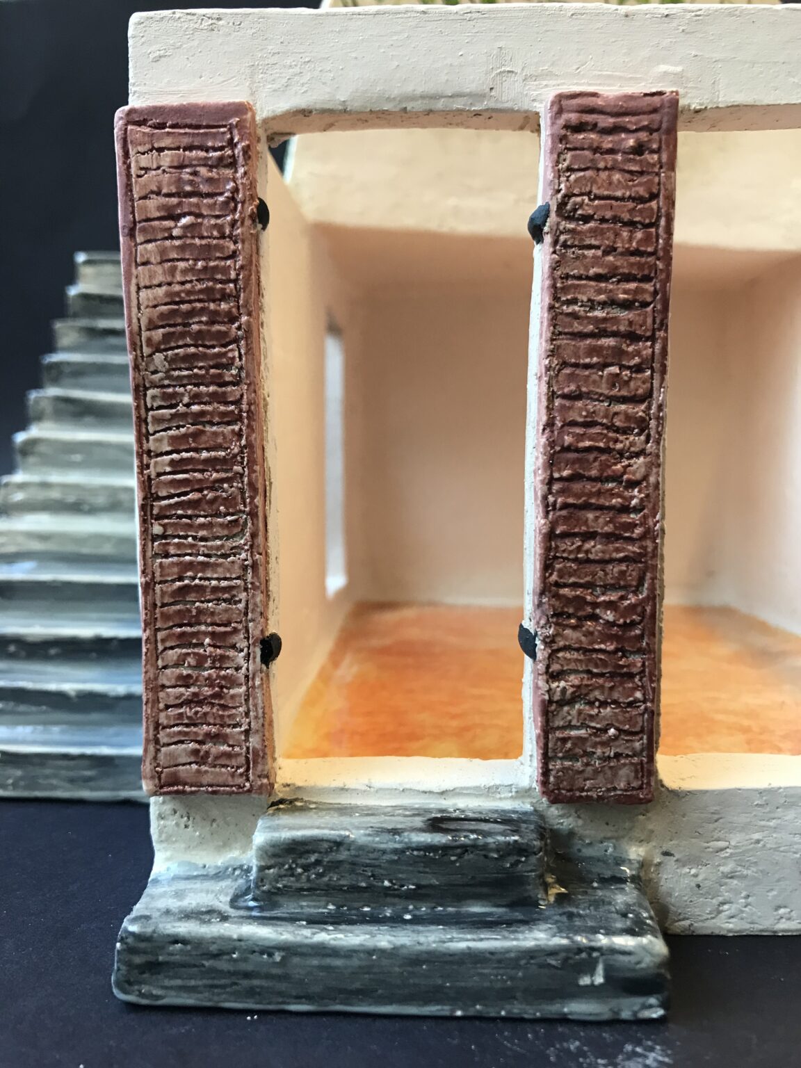 Lors de ma formation, j’ai également dû réaliser un mini atelier de céramique. Même si le travail de la miniature ne correspond pas particulièrement à ma pratique, l’exercice a été une expérience plutôt rigolote. Cela m’a surtout permis de me rendre compte que je ne serai jamais architecte : pour accéder à une terrasse, il est essentiel de ne pas laisser d’espace vide pour monter sur un toit… 🙂