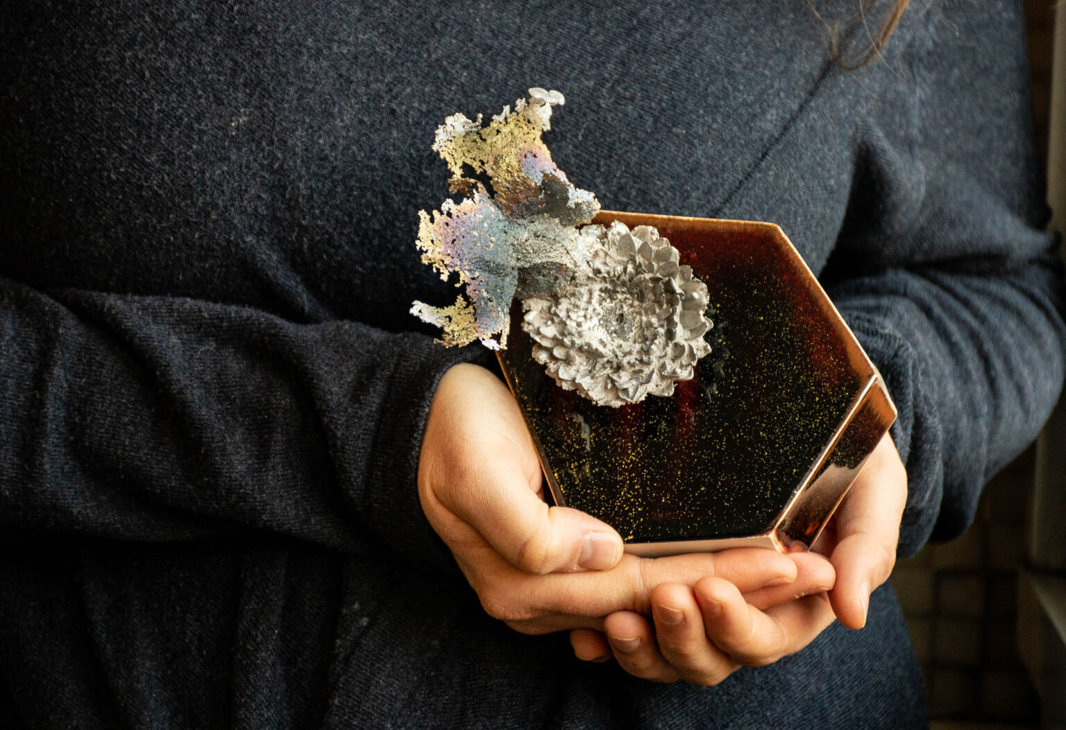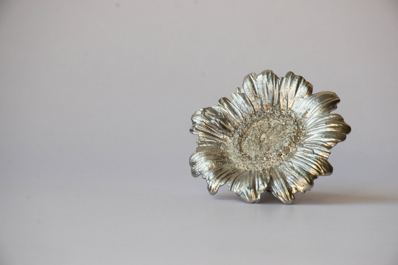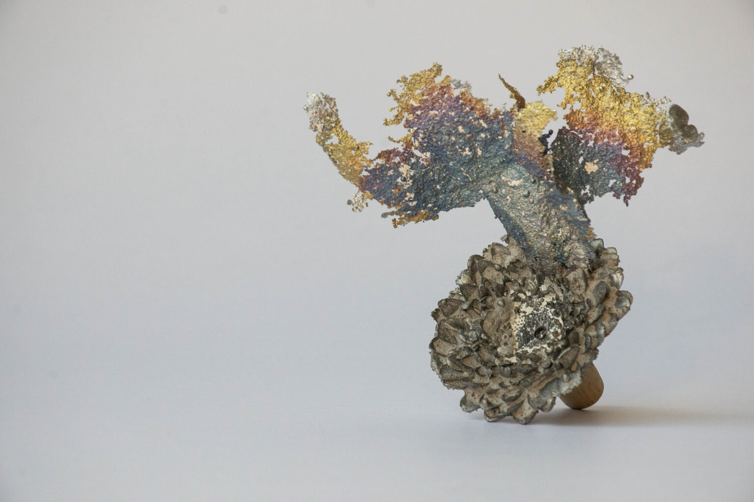 Pour les bouchons, j’ai expérimenté la fonte à partir de fleurs véritables, moulées puis coulées en moule perdu. J’ai travaillé avec différents métaux, notamment l’aluminium et l’étain. Chaque bouchon est façonné à la main, rendant chaque pièce unique.
