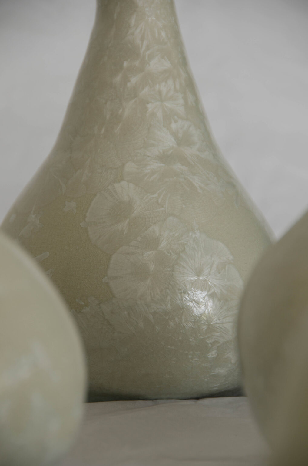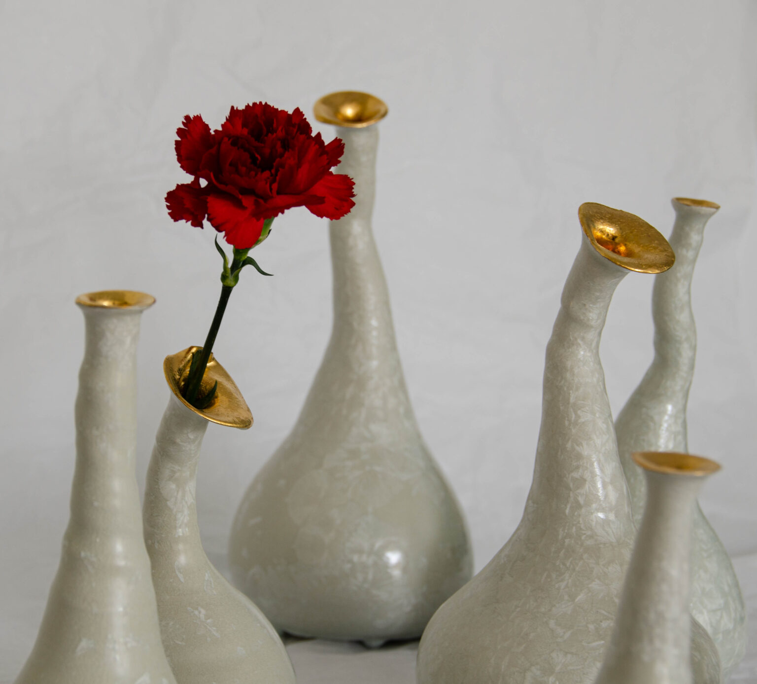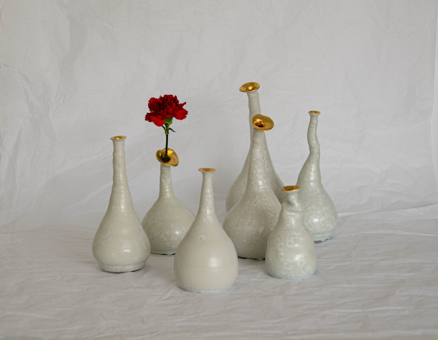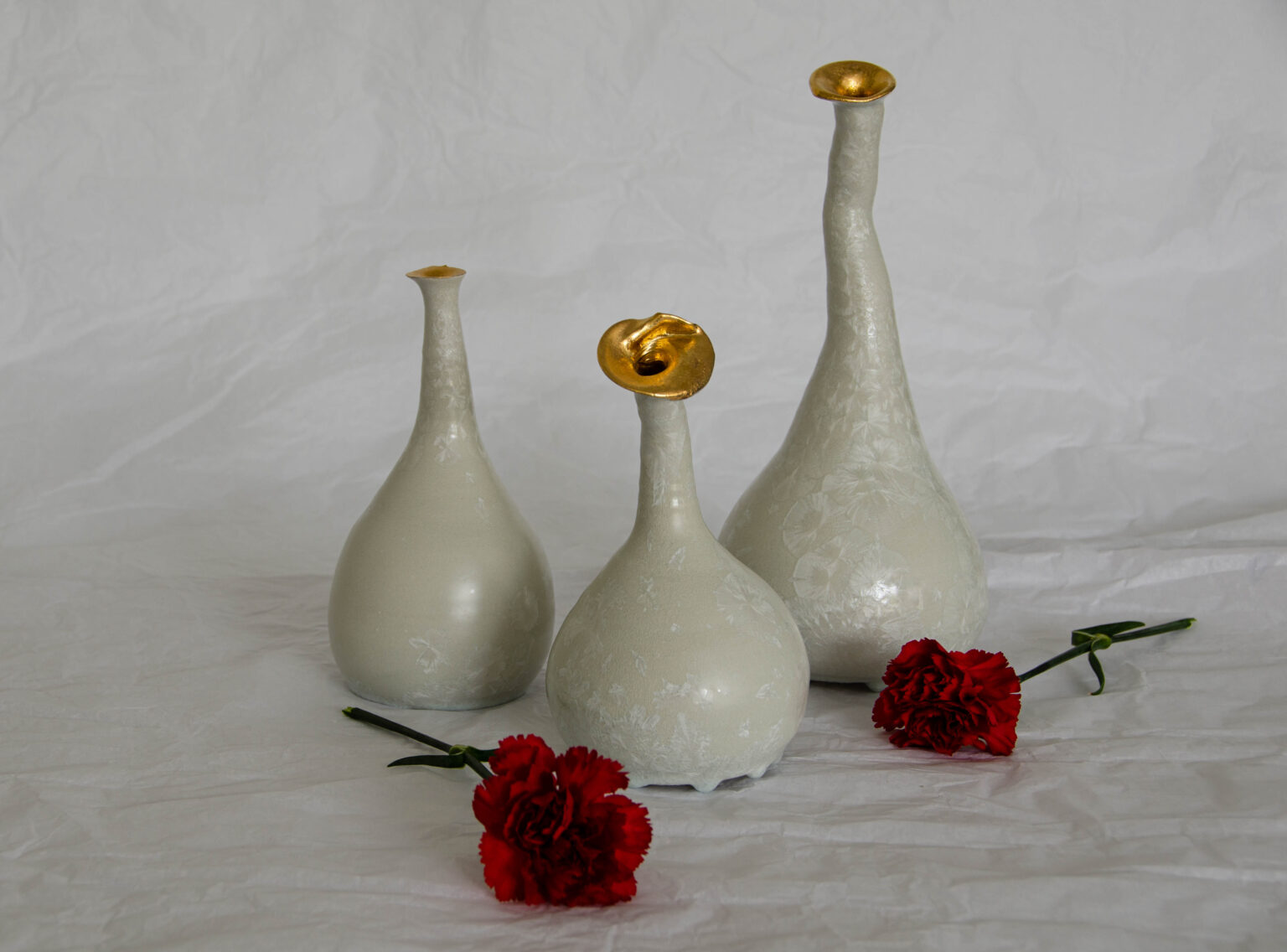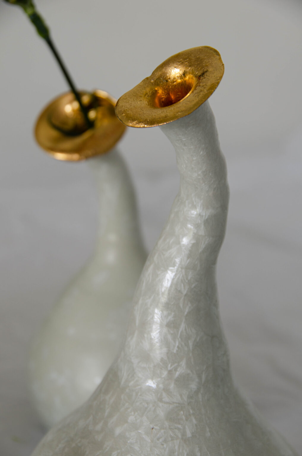 Les danseuses sont réalisées au tour de potier. Ces vases sculpturaux en porcelaine sont recouverts d’un émail à cristaux, tandis que les têtes sont rehaussées d’or. Chaque pièce est unique.